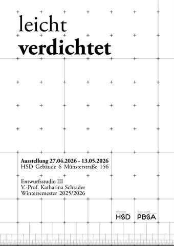 27.04.2026Peter Behrens School of Arts / Ausstellung, Master, EntwerfenAusstellung "leicht verdichtet"Einladung zur Ausstellung „leicht verdichtet“ (Masterentwurf). Gezeigt werden Entwürfe für temporäre, flexible Leichtbaustrukturen in Kölner Baulücken – als Prototypen für verdichtetes Wohnen und Arbeiten, schnell errichtbar und wiederverwendbar.