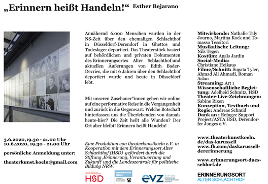 Die Produktion von theaterkunstkoeln e.V. in Kooperation mit dem Erinnerungsort Alter Schlachthof (Hochschule Düsseldorf) wurde gefördert durch die Stiftung „Erinnerung, Verantwortung und Zukunft“ und die Landeszentrale für politische Bildung NRW.