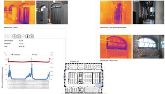 Die Auswertung und Darstellung erster Messungen sowie die Auswahl geeigneter Kompensationsmaßnahmen stand an den beiden folgenden Tagen im Fokus, wobei sich die Gruppe immer neu aufteilen und verschiedene, meiste neue Phänomene betrachten und dann in geeignete Darstellungen übertragen musste. Abbildung 1 zeigt dazu exemplarisch einige Untersuchungen im EG des Gebäudeteils der Campus-IT. Geringen Raumtemperaturen und Luftfeuchtewerte können u.a. durch Wärmebrücken (Stahlaußentüren) und gekippte Fenster sowie ein aus denkmalschutzgründen kaum gedämmte Außenwand zurückgeführt werden.