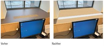 Ergebnis ist ein vielfältiger Katalog von überwiegend niedriginvestiven Maßnahmen, die kurzfristige Minderungen beim Energieverbrauch und zugleich gesteigerter Behaglichkeit in den beiden Gebäudeteilen versprechen. Hier sind beispielhaft die Veränderung der Situation der Heizkörper in der Bibliothek (Verringerung des Hitzestaus unterhalb der Fensterbänke und Verbesserung des Wärmeaufstiegs durch Luftauslässe, siehe Abbildung 3) oder die Veränderung der Eingangssituation am Haupteingang der Bibliothek (Tausch einer immerzu offenstehenden Schwingtür gegen eine Drehtür, siehe Abbildung 2) zu nennen. Die Ergebnisse und Maßnahmen werden in den o.g. Klimaschutzplan übertragen und zur Weiterverfolgung verwendet. Die Ergebnisse wurden den Beteiligten anhand von Plakaten vorgestellt (Abbildung 4).