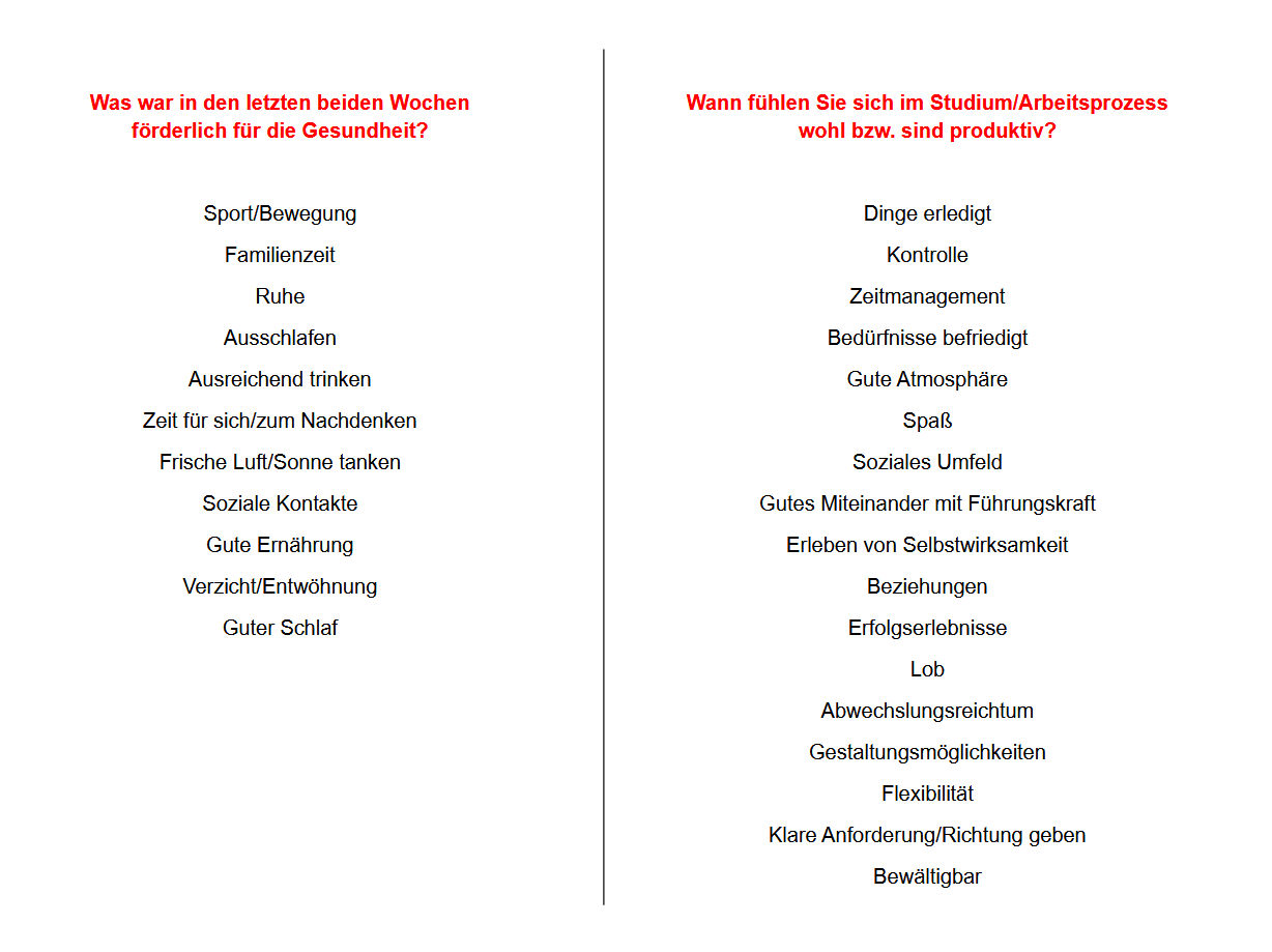 Beim Auftakttreffen "Gesundheit im Studium" im Januar 2025 haben die Teilnehmenden folgende Beispiele gesammelt, was zum Wohlbefinden beiträgt: