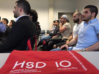 Am Freitag, dem 19. Mai 2017, besuchten 20 Geflüchtete, die sich für ein Studium an der HSD interessieren, und vier ehrenamtliche Helferinnen und Helfer die Hochschule Düsseldorf. Das International Office hatte für die Flüchtlingsinitiative Duesseldorf-aktiv.net e.V. eine Informationsveranstaltung und einen Campus-Rundgang organisiert.